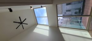 吹抜けのリビングには、光取りの高窓、シーリングファンもあり、とてもオシャレでした。